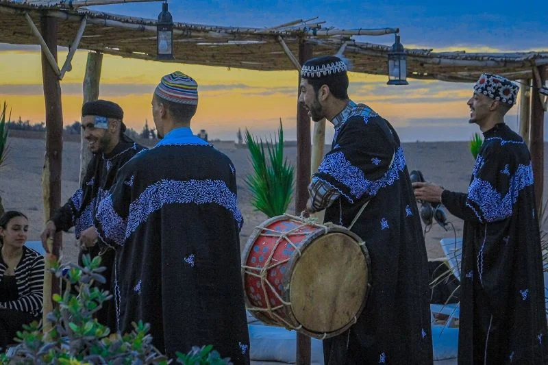 Watch the sun set as the moon and stars take their place, making you feel like the true Lawrence of Arabia under the vast Agafay desert sky. Immerse yourself in authentic Moroccan flavors with a warm welcome of tea and sweets.